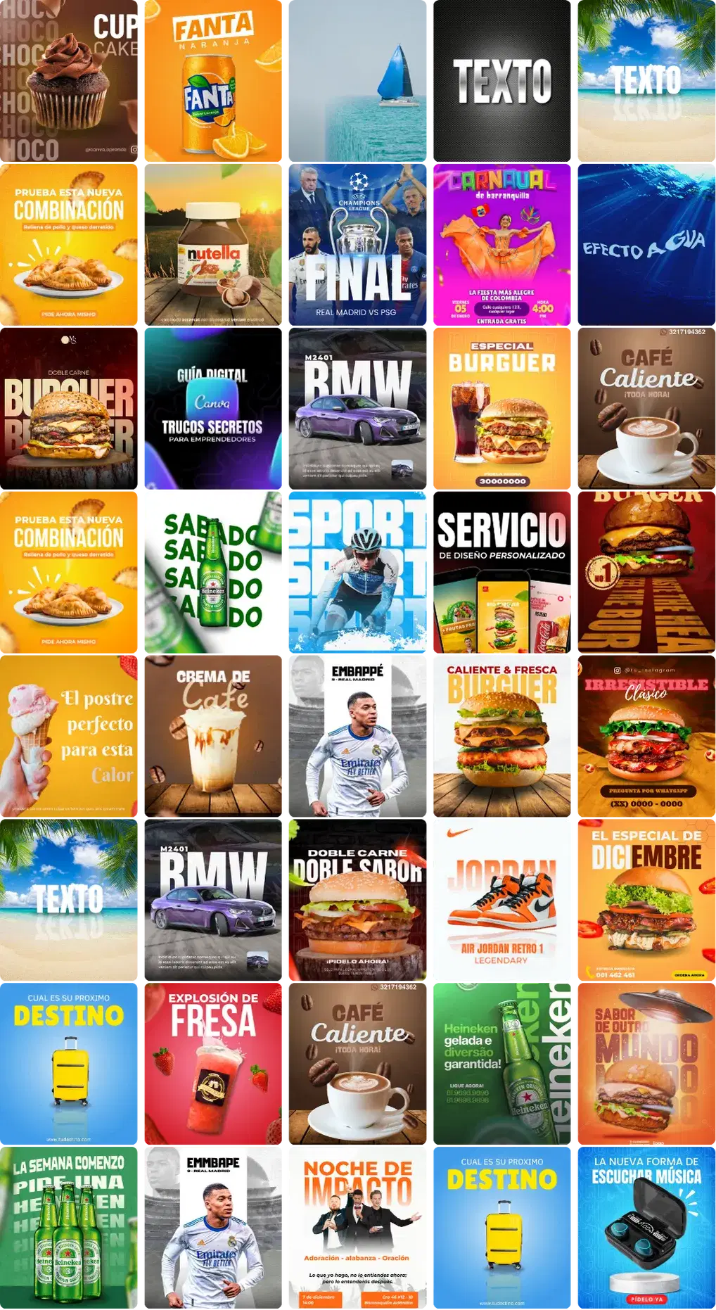 Estas plantillas estan optimizadas para vender y mostrar tus productos o servicio dentro de internet, adicionalmente tenemos algunas plantillas para posters, flyers pero nuestra gran mayoria son para internet, (historias, animaciones, post de instagra etc)